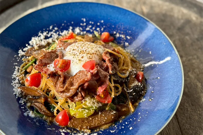 食材の旨みをギュッと詰め込んだソースに、柔らかい和牛と海老名で取れた卵を使った温泉玉子を絡めて!